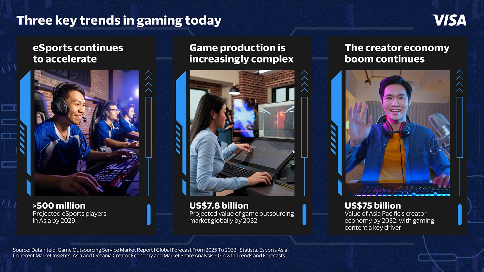 - Pay and be paid almost instantly, with anyone: With Visa Direct, you can pay, track, and manage payments to esports and gaming key opinion leaders (KOLs), creators and marketing agencies at the tap of your finger. Connecting over 11 billion payment endpoints in over 195 countries and territories and integrated with more than 160 currencies, Visa Direct brings your game to the world with ease.